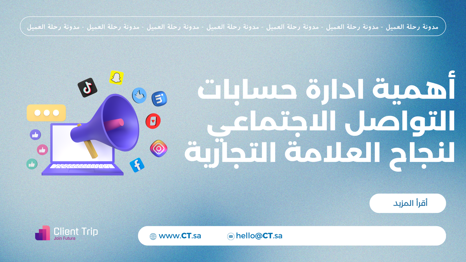 وسائل التواصل الاجتماعي ليست فقط وسيلة ترويج بل هي اداة لبناء علاقة حقيقة مع الجمهور وتعزيز الثقة والولاء في ادارة حسابات التواصل الاجتماعي بشكل صحيح يمكن أن يكون هناك النجاح والتميز في السوق التنافسي، اذا وقتك ضيق وتبي تدير حساباتك بشكل كامل وتحصل على نتائج فعالة فريقنا في شركة Client trip يدير حساباتك بالكامل بدايةً من التعديل إلى إنشاء المحتوى ونشره وتحليله. اطلب خدماتنا الآن ولا تضيع الوقت.